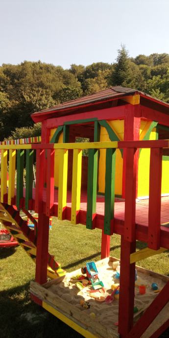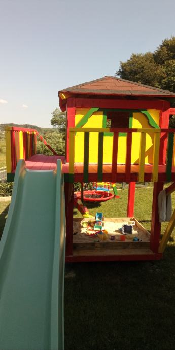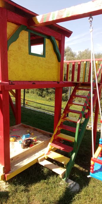 Dječje igralište masivno i kvalitetno.Zaštita sa lanenim uljem,te boja na bazi sintetike koje se ne ljušti za godinu dana,inox stope koje se podešavaju i nema straha od truljenja drva .Bitumenska šindra na krovu bez prokišnjavanja.Na podu je paropropusna vodonepropusna folija .Drvo je obrađeno .Kućica se ne Ljulja ko ostale iz trgovina i na na nju mogu odrasle osobe i djeca.Sa bojom ili bez,ili može i bez opreme.Moguća dostava i montaža.0995010918