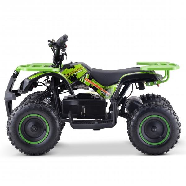 Litijska baterija od 36 V 10 Ah jamči veliki domet od oko 12 do 18 km (ovisno o opterećenju i terenu) Baterije se nalaze u plastičnom kućištu, pričvršćenom brzom spojnicom, tako da se po potrebi mogu izvaditi u nekoliko sekundi i prikladno napuniti izvan quada. Do tjelesne težine od 60 kg, dječji ATV od 1000 W ostaje okretan u svakom trenutku. Četverotočkaš je automatski, mijenja samo naprijed ili natrag.