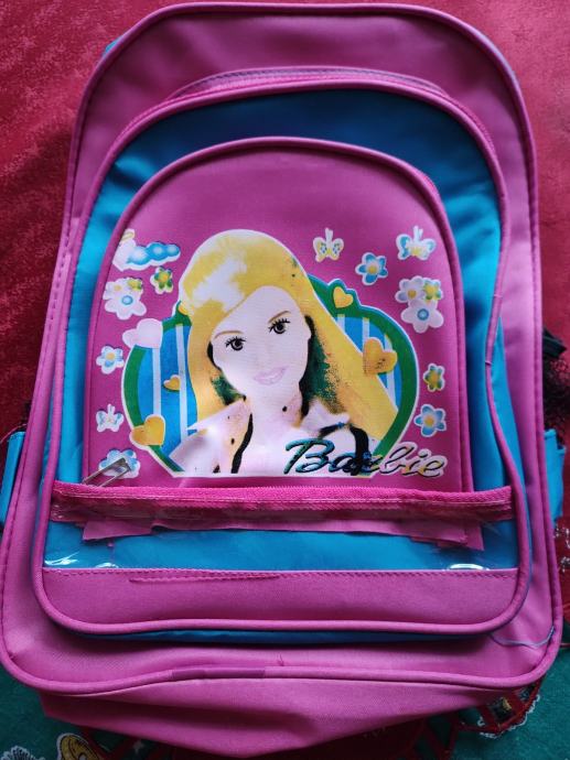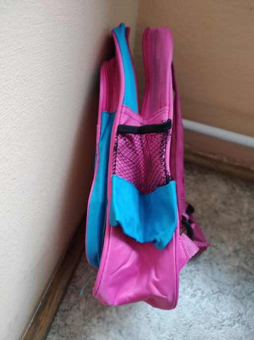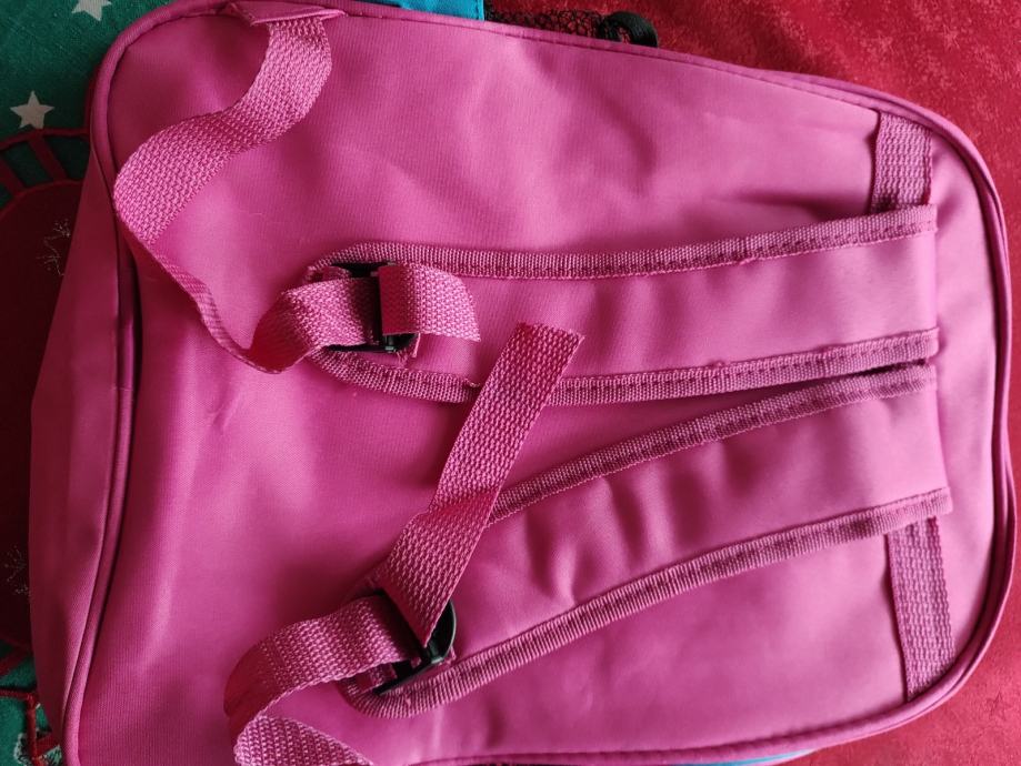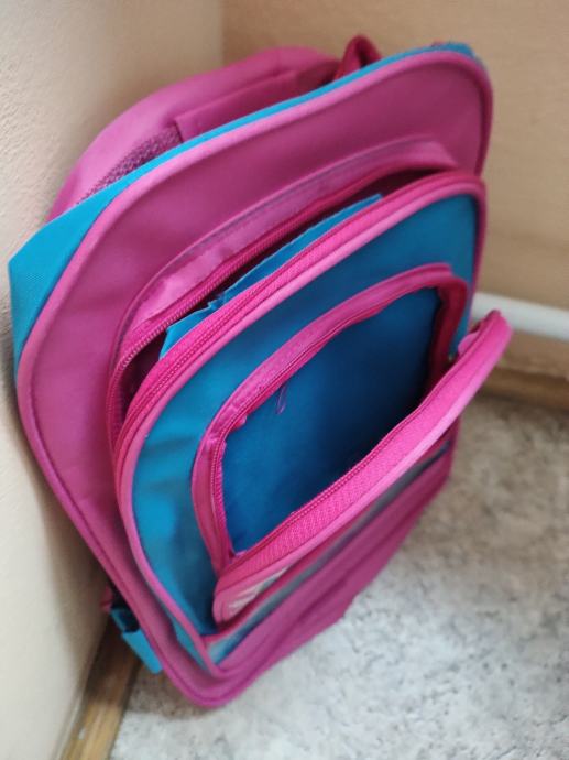 Ružičasto plavi dječji ruksak, visina 38, širina 27, dubina 10 cm. Osim prostrane unutrašnjosti, ima i dva vanjska prekratka te jedan manji, svaki s patentnim zatvaračem te džepićim sa strane. Nov