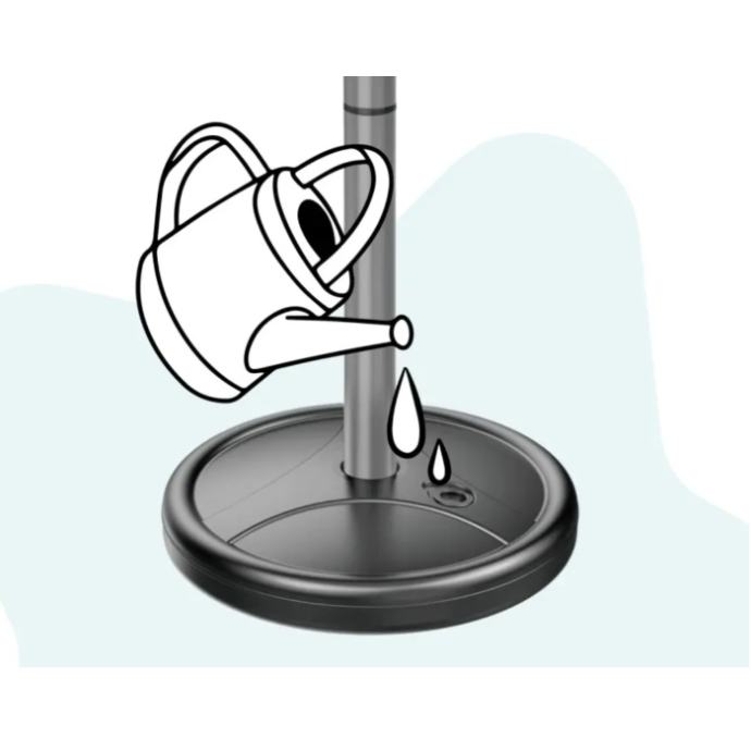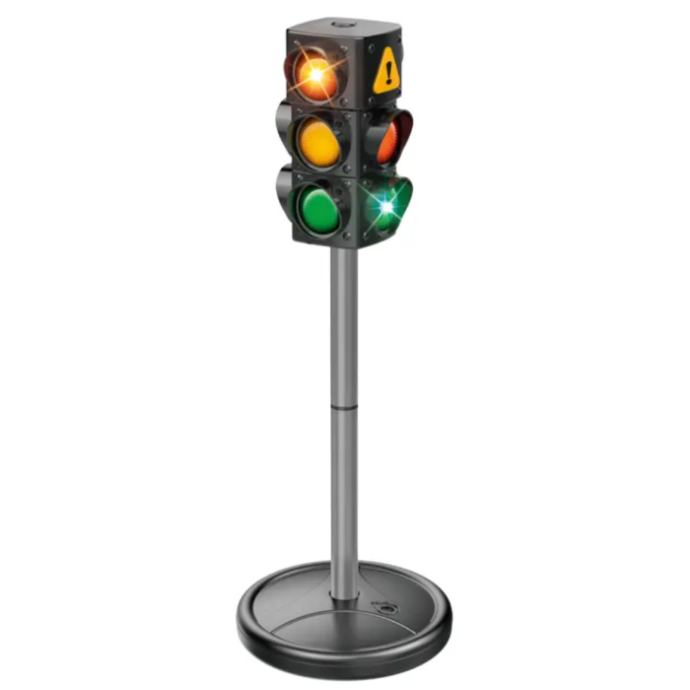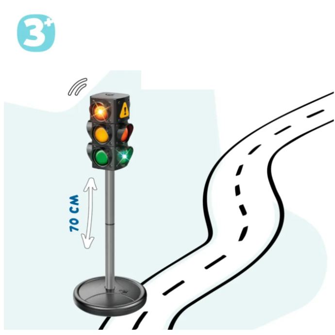 Edukativni semafor na baterije visok je otprilike 70 cm i stoji na okruglom postolju (Ø 20 cm) koje se može napuniti vodom ili pijeskom za dodatnu stabilnost - idealno za vjetrovite dane ili čvrsto uporište na glatkim podovima.