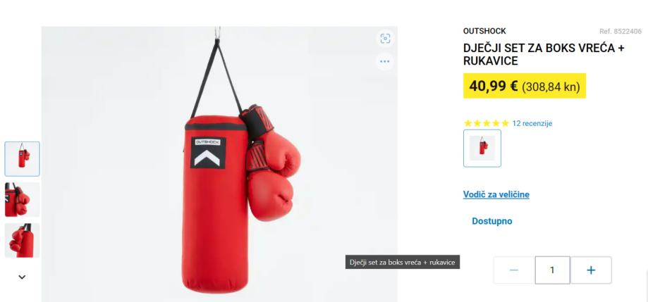 - sintetičku boksačku vreću prekrivenu kvalitetnom poliesterskom tkaninom. Prikladna za vježbanje udaranja. Sustav za vješanje s vrlo čvrstim ojačanim remenima.