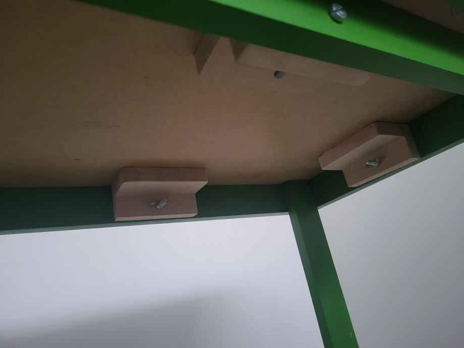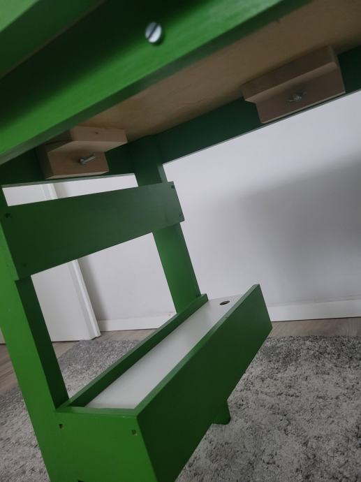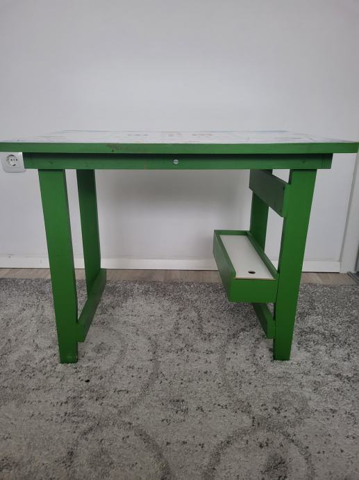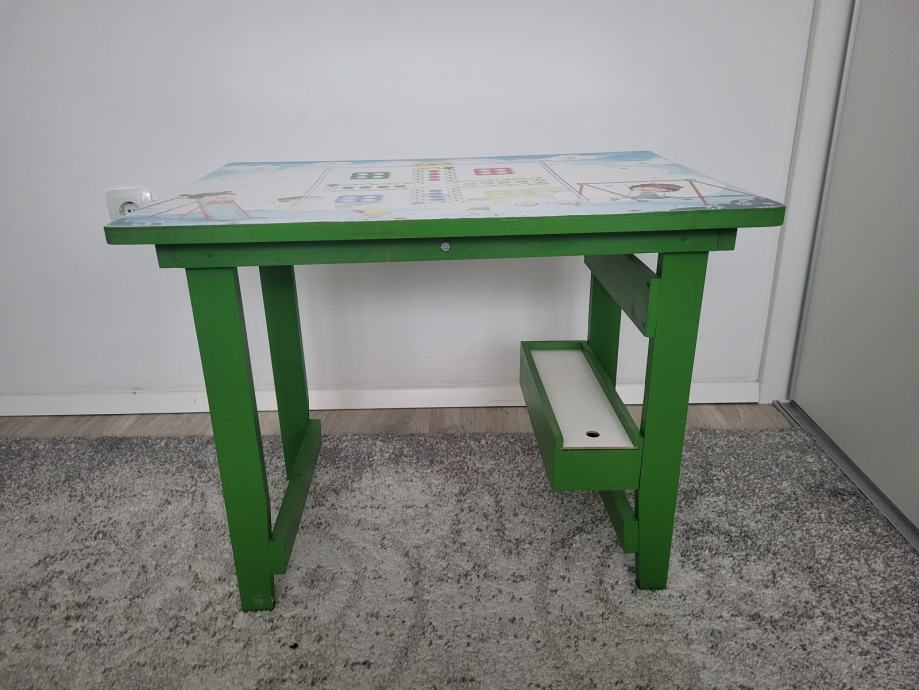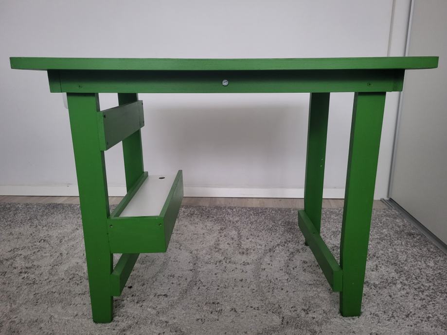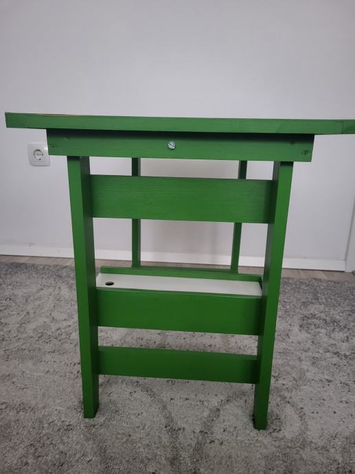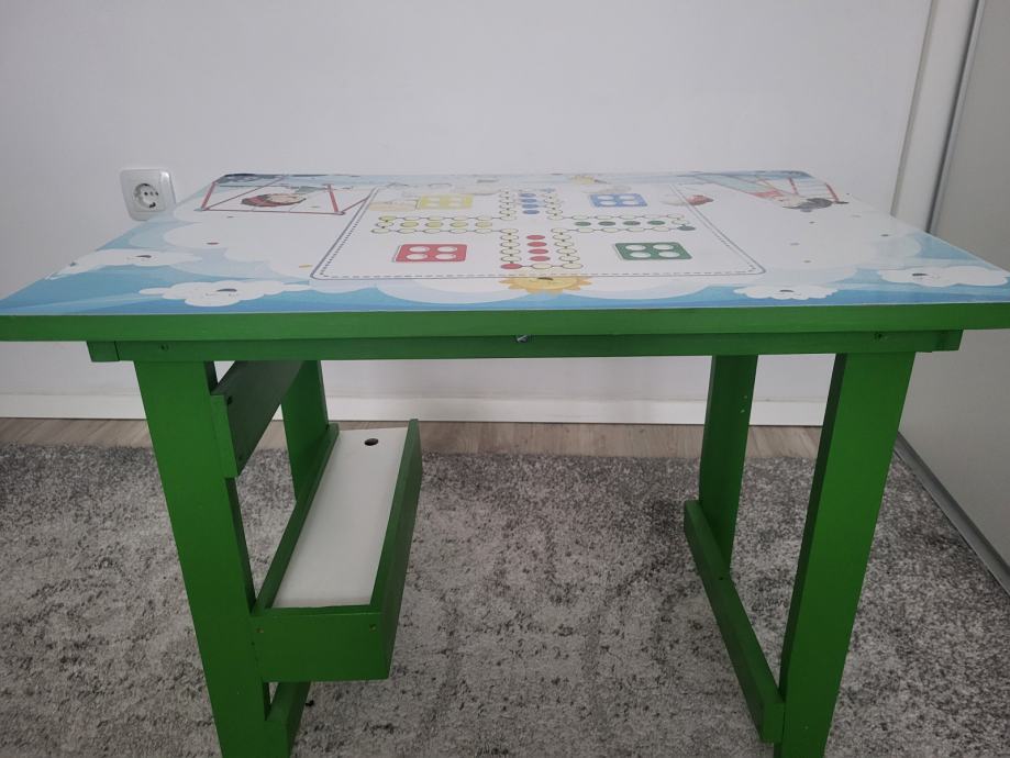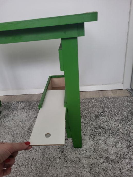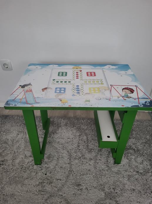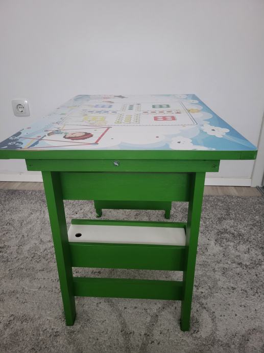 Ručno rađen, proizveden u Hrvatskoj, čvrst, zelene boje. Ima kliznu ladicu na dnu, u njoj su figurice za igru i kocka, na gornjoj plohi je igra Čovječe ne ljuti se koja je malo izlizana od korištenja. Može se odlijepiti, zalijepiti nešto drugo. Sve ostalo u odličnom stanju. Dužina 63cm, širina 45cm, visina 50cm.