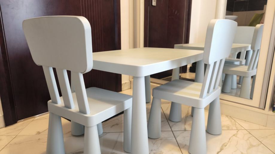 Dječji stol sa dvije pripadajuće stolice plave boje. Za dječju sobu ili dvorište.