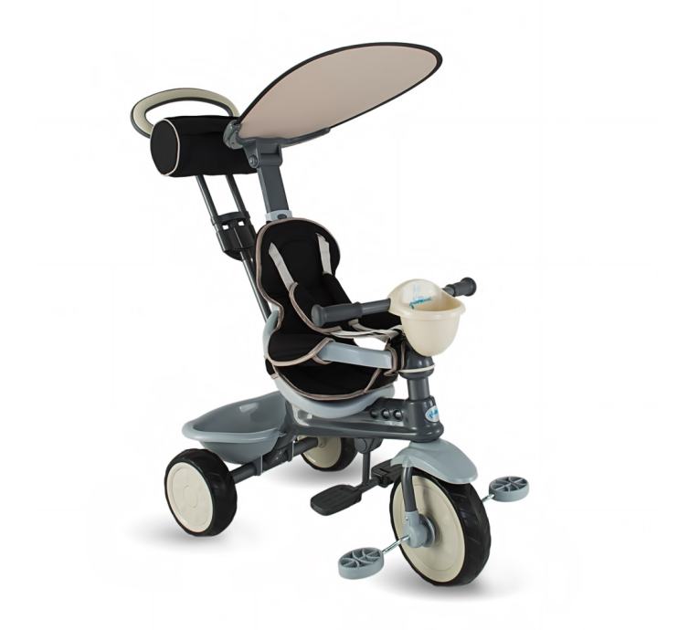 Ručka kojom se upravlja triciklom je odvojiva i podesiva po visini tako da pruža super roditeljski doživljaj. Opremljen je odvojivim krovićem i sigurnosnim pojasom s 3 točke, koji štiti bebu od sunca i pada s tricikla. Naslon sjedala, ručica i podnožja za noge mogu se ukloniti te se potom tricikl pretvara u klasični tricikl.