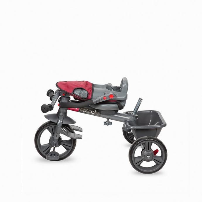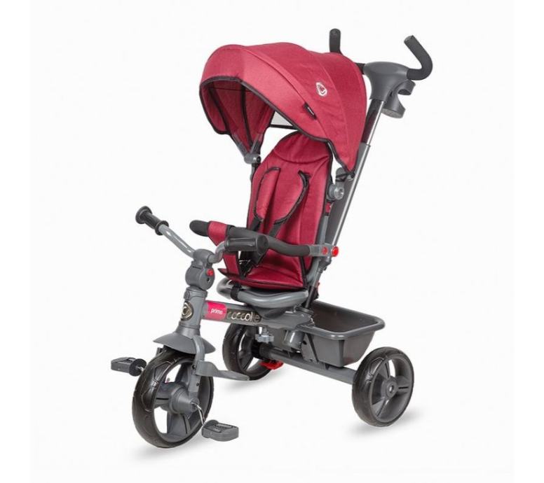 Tricikl Coccolle Primo crveni svestran je proizvod, dizajniran za dugotrajnu upotrebu tijekom cijelog razdoblja rasta i razvoja mališana. Opremljen je svim priborom namijenjenim duljem korištenju: pomoćnom šipkom za roditelja i osloncem za noge; krović za zaštitu od sunca, sjedalo i naslon za vrijeme kada mališan može pedalirati, ali se često umara.