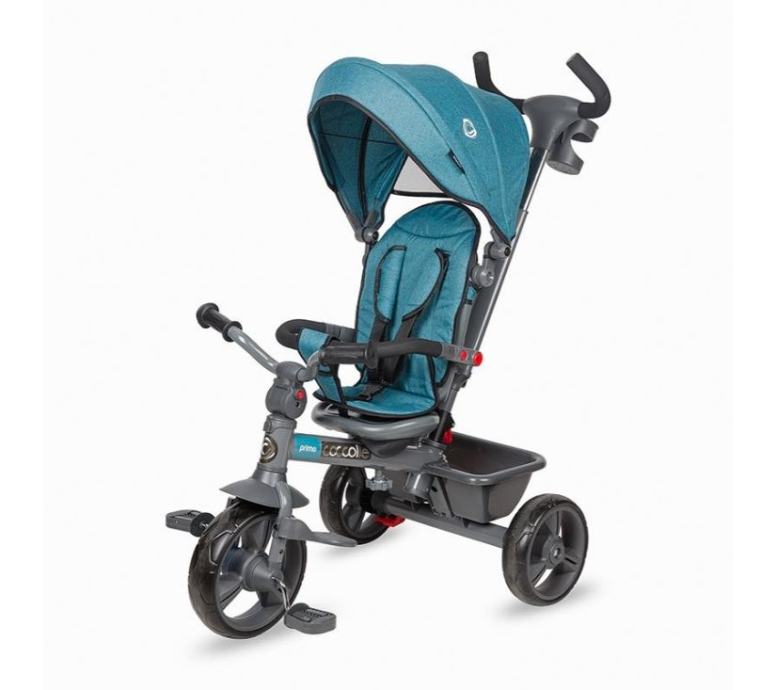 Tricikl Coccolle Primo tirkizni svestran je proizvod, dizajniran za dugotrajnu upotrebu tijekom cijelog razdoblja rasta i razvoja mališana. Opremljen je svim priborom namijenjenim duljem korištenju: pomoćnom šipkom za roditelja i osloncem za noge; krović za zaštitu od sunca, sjedalo i naslon za vrijeme kada mališan može pedalirati, ali se često umara.