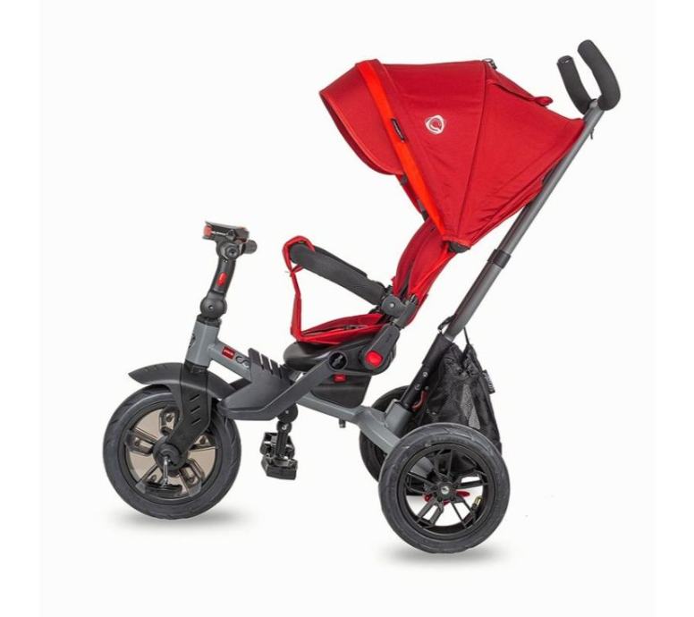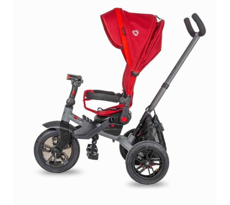Nakon što je mali dovoljno narastao, ovaj dječji oslonac za noge može se maknuti, a tricikl će se koristiti s djetetovim naslonom za noge. Također, kako dijete raste, tenda se skida, naslon, pomoćna roditeljska šipka što rezultira klasičnim triciklom koji se može koristiti do dobi od 3-4 godine. Dvostruka stražnja kočnica osigurava stabilno parkiranje bez obzira na to kako se koristi.