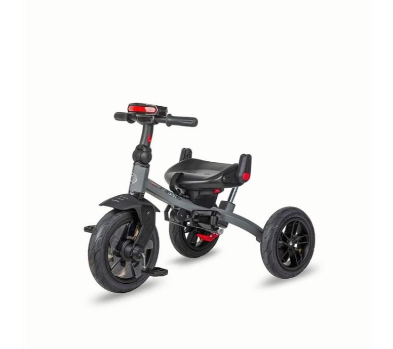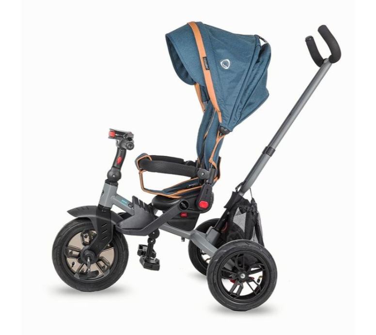 Nakon što je mali dovoljno narastao, ovaj dječji oslonac za noge može se maknuti, a tricikl će se koristiti s djetetovim naslonom za noge. Također, kako dijete raste, tenda se skida, naslon, pomoćna roditeljska šipka što rezultira klasičnim triciklom koji se može koristiti do dobi od 3-4 godine. Dvostruka stražnja kočnica osigurava stabilno parkiranje bez obzira na to kako se koristi.