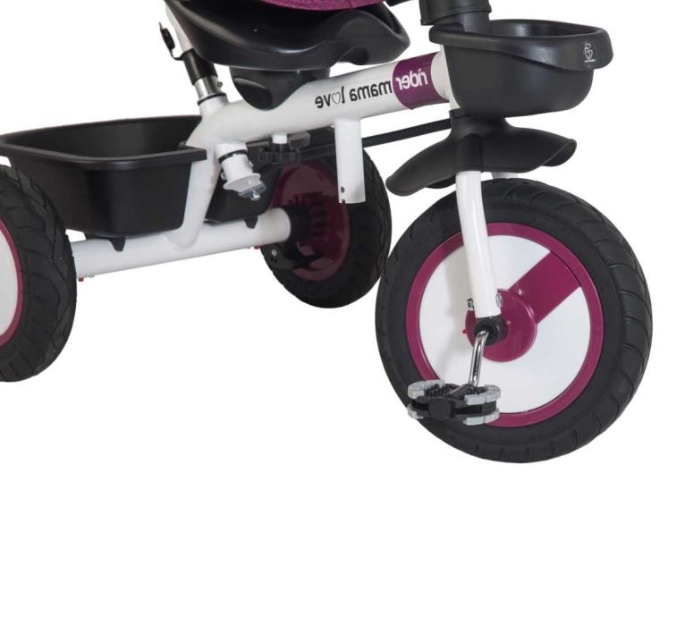 Tricikl Rider sivi opremljen je gumenim kotačima i kočnicama. Podesiva drška upravljača omogućuje roditelju da vozi tricikl s jednom rukom.