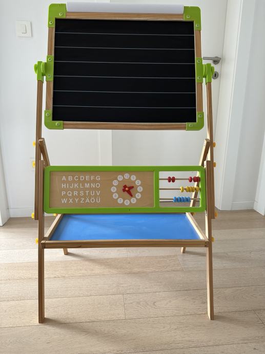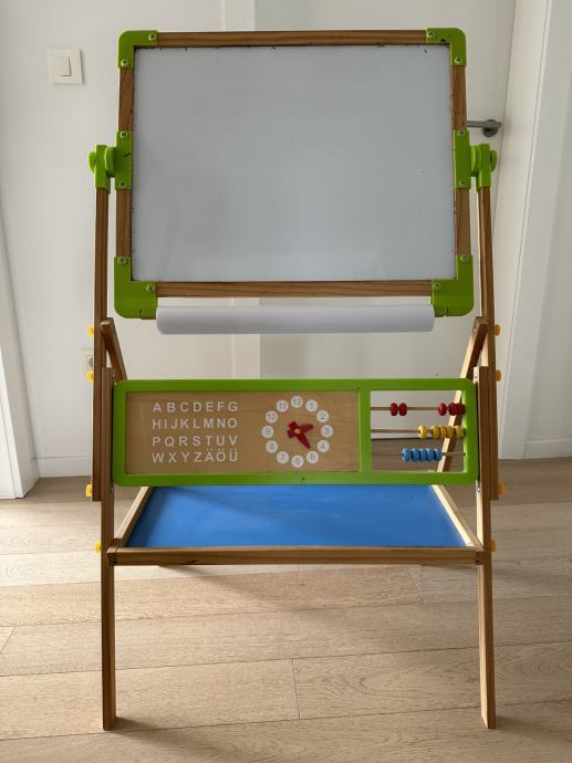 Omogućuje djetetu da piše i crta šarenim kredama na crnoj strani ploče i markerom na bijeloj strani.