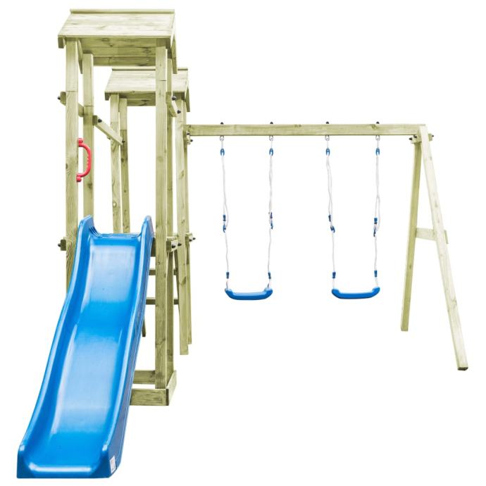 Ovaj visokokvalitetni drveni komplet za igru napravljen je od čvrstog, tlačenog drva i tvrde plastike u svjetlim bojama. Sastoji se od drvenog okvira, tobogana, 2 ljuljačke i nekih struktura za penjanje. Svi ovi dodaci mogu se koristiti za penjanje, puzanje, skrivanje i spuštanje niz tobogan.