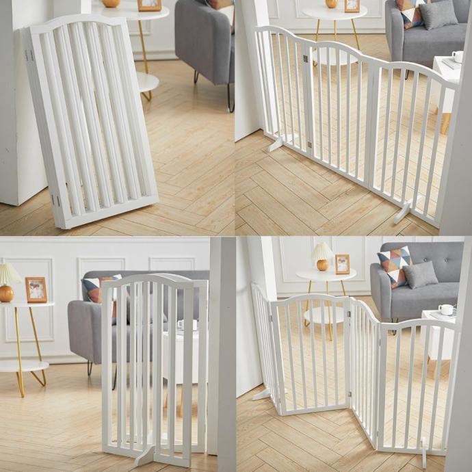 Ograda se sastoji od 4 sklopiva panela spojenih metalnim šarkama koje se zakreću za 360°. To vam omogućuje prilagodbu širine i oblika prema potrebi – bilo da ju postavljate na vrata, stepenice, hodnik ili drugi prolaz.
