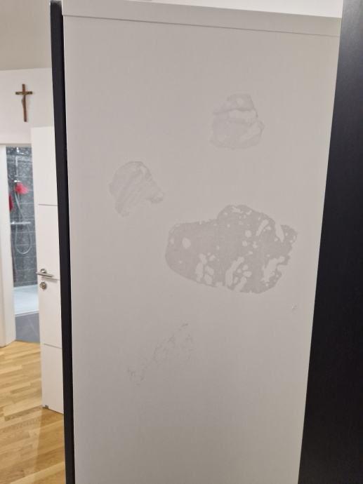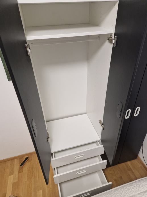 2. ormar ima policu, šipku za vješanje, 2 uže ladice, 1 dublju ladicu - na njemu su s bočne strane bile zalijepljene naljepnice i kad su skinuti ostale su fleke od skidanja koje se ne daju skinuti. Ako su ormar jedan do drugoga kao na fotki, isto se be vidi.