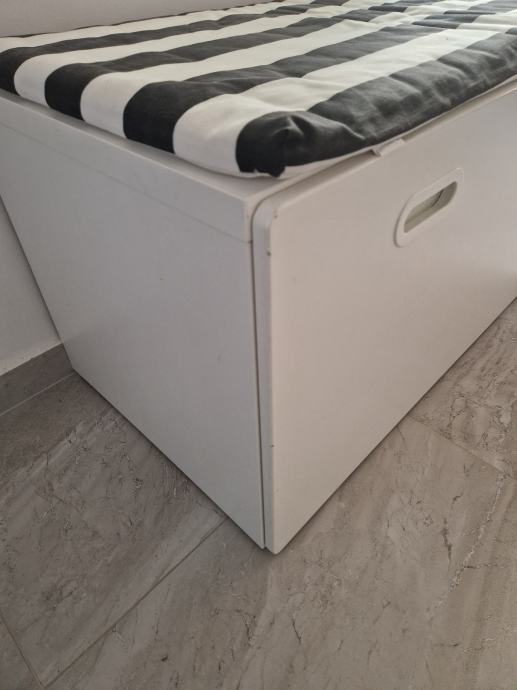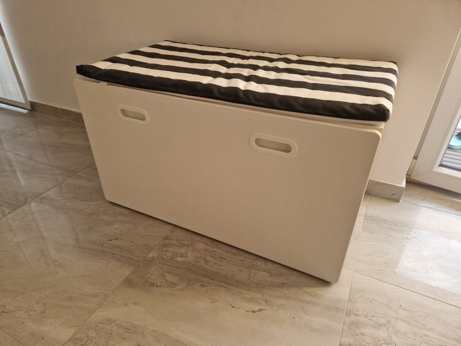 Prodajem i IKEA STUVA klupicu bijele boje s crno-bijelim jastukom i dubokom ladicom za spremanje stvari.