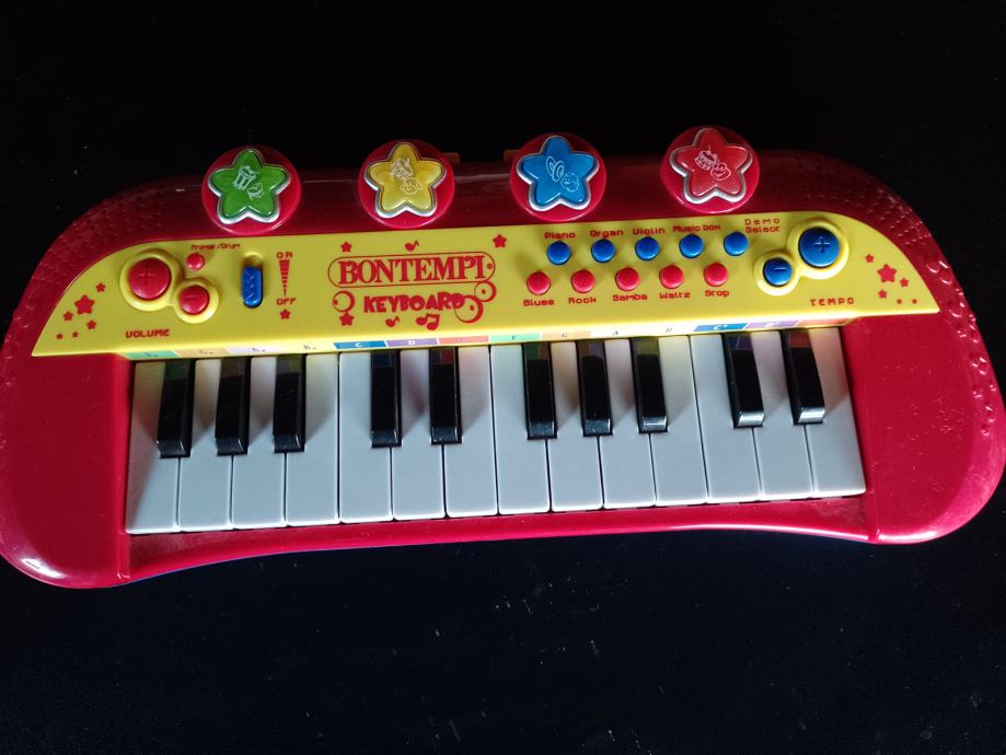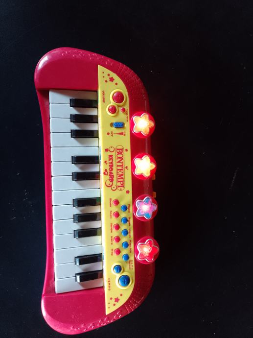 Imala je mali mikrofon al' je izgubljen. Inače za djecu vrlo dobar, ima više zvukova i melodija kao i svjetlosni efekti,radi na AA baterije. Dužina 33 cm.