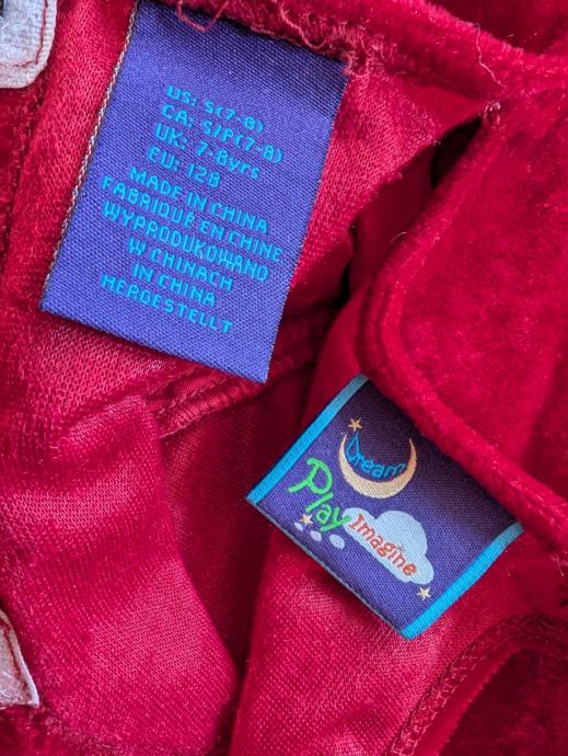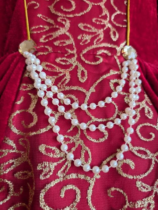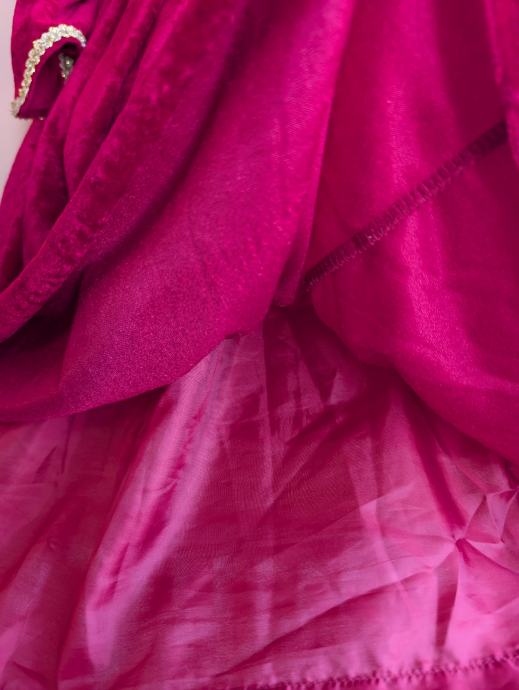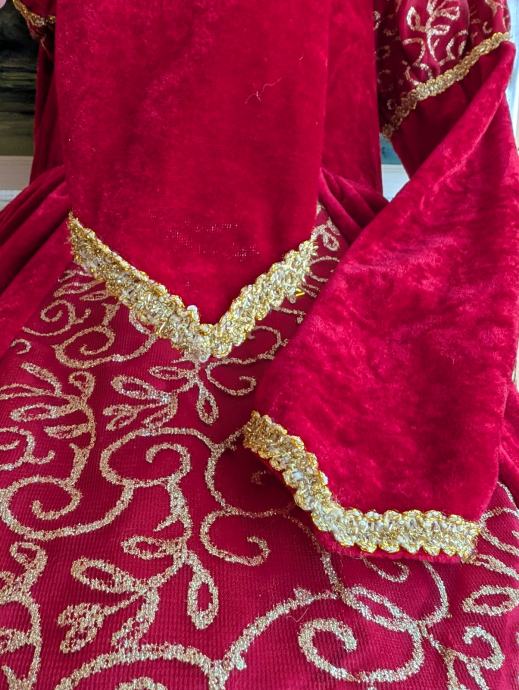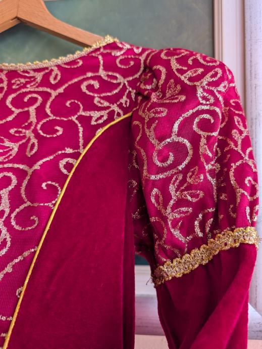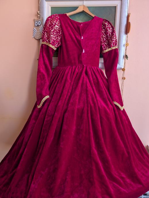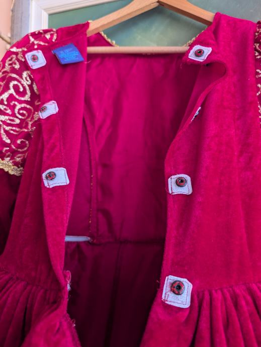 Ima pufasta ramena, rukave sa slatkim trokutastim uzorkom kako se nekad davno nosilo i svjetlucavim detaljima, može se nositi i ranije pa je duža, do poda, ali i kasnije. Veličina je 122 / 128 tj 7 - 8 godina, no mi smo nosili i s 9.5 godina.