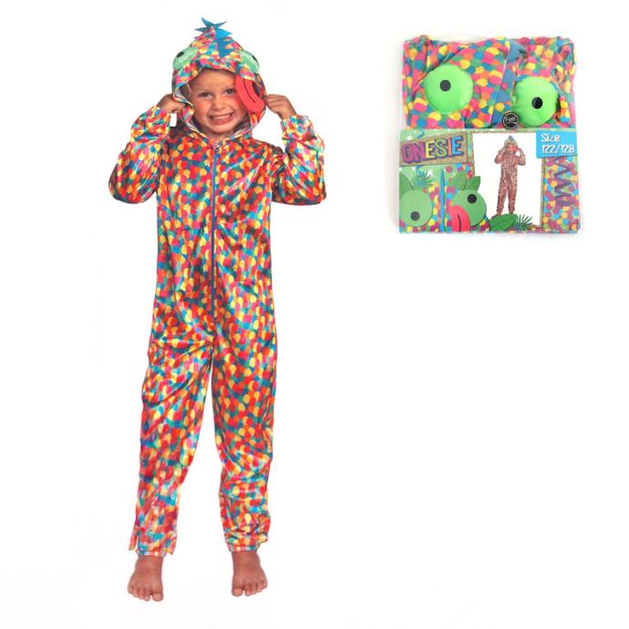Šareni plišani kombinezon u obliku kameleona idealan je za djecu koja vole jedinstvene i maštovite kostime. Savršeno kombinira živopisne boje, udobnost i praktičnost, a namijenjen je djeci visine 122-128 cm, što odgovara dobi od otprilike 7 do 8 godina.
