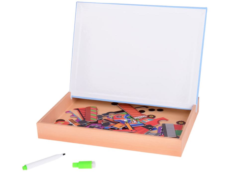Magnetna ploča 2u1 idealna je edukativna igračka za male konstruktore! Djeca po njoj mogu crtati flomasterom za suho brisanje, kao i slagati magnetske slagalice sa slikama građevinskih vozila. Ova višenamjenska ploča razvija kreativnost, motoričke vještine i maštu, a pritom pruža puno zabave. Sadrži magnetske slagalice koje prikazuju građevinska vozila, uključujući: dizalicu, traktor s prikolicom, buldožer, kiper i površinu za crtanje markerom za suho brisanje. Dijete može rekreirati uzorke vozila ili stvarati vlastite kompozicije, razvijajući maštu i ručne vještine. Ploča ne samo da potiče kreativnost, već i podržava razvoj fine motorike i koordinacije oko-ruka.