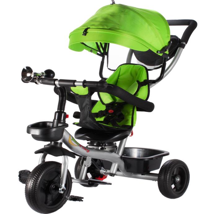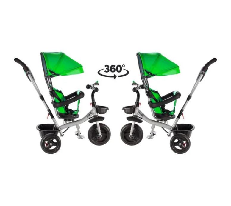 Naš tricikl omogućuje rotiranje sjedala za 360 stupnjeva ovisno o potrebama i dobi djeteta. Mlađa djeca neka se voze okrenuta prema roditeljima kako bi mogli stalno pratiti sigurnost svog djeteta tijekom vožnje. Kad dijete odraste, može preuzeti kontrolu nad biciklom i odrediti smjer vožnje sjedeći leđima okrenuto roditelju. Bicikl ima bravu koja sprječava spontanu promjenu sjedala tijekom vožnje.