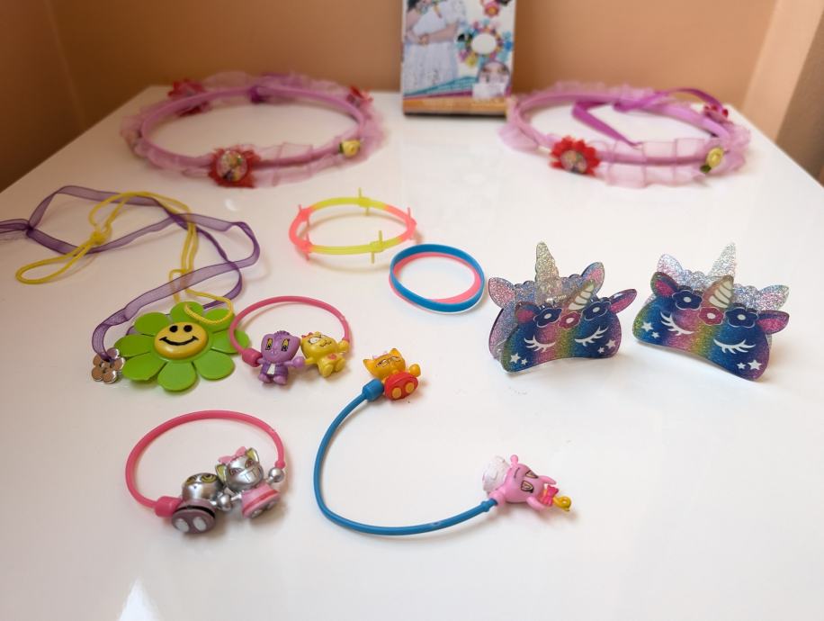 Veliki komplet sadrži jako lijepe narukvice, ogrlice, dvije jednorog kopče za kosu (jedna je na poklon), dva remena na kojima je Zlatokosa (preslatko stoje na haljine), naušnice srce i duga (tri para) koje su na klipsu - samo se stave na uho, tu su i prsteni, kao i kutija s puno veselih, šarenih dijelova za izradu narukvica, odlično za finu motoriku.