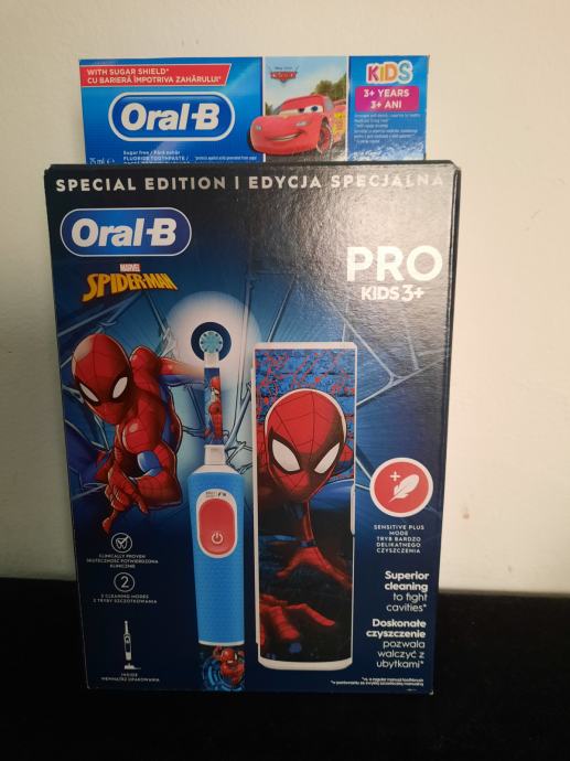 Električna zubna četkica Oral-B Pro Kids, koju stomatolozi preporučuju za dob 3+, omogućuje djeci nježno, učinkovito čišćenje zubi. Uz 2 načina rada, uključujući jedinstven način rada prilagođen osjetljivim dječjim desnima, ova četkica nježno čisti dječje zube. Uklanja više zubnih naslaga od obične klasične zubne četkice. Dolazi s četiri tematske naljepnice za ukrašavanje drške.
