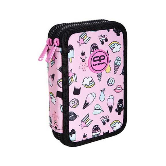 Kvalitetna puna školska pernica sa 2 zip-a. Pernica sadrži 35 komada školskog pribora; 12 bojica + 18 flomastera + 1 ravnalo + 1 gumicu + 1 šiljilo + 1 grafitnu olovku + 1 kemijsku olovku. Materijal: 100 % poliester. Dimenzije: 19,5x12,5x5 cm.