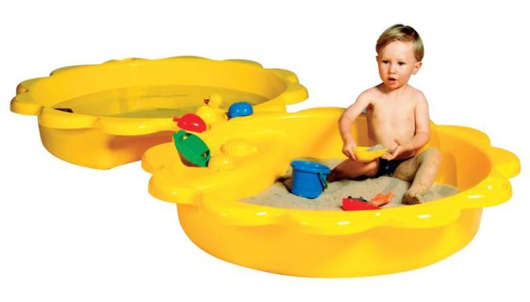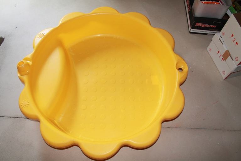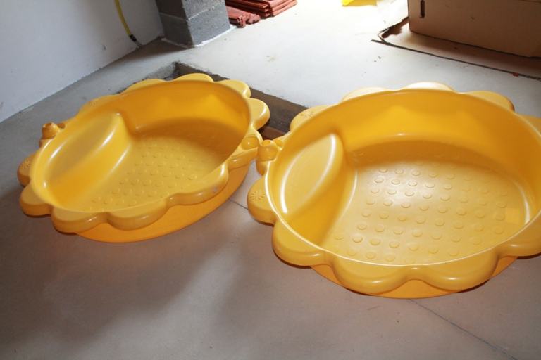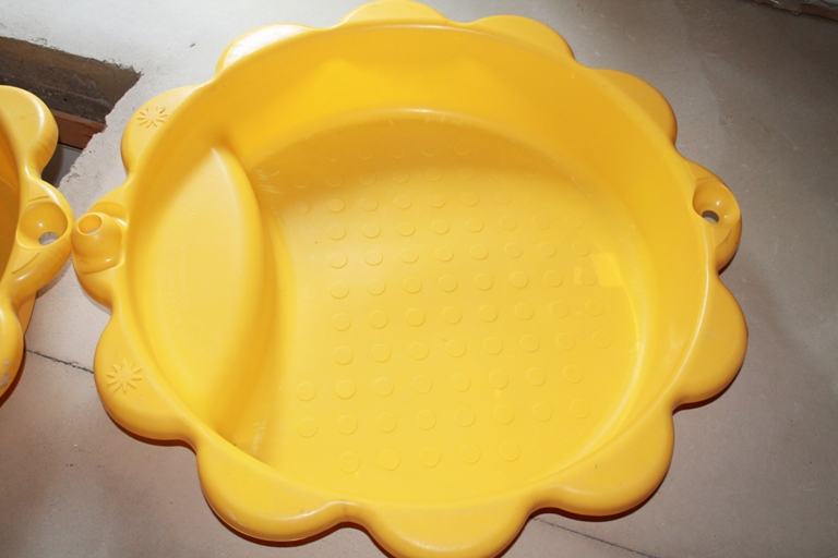 Plastični pješčanik u obliku sunca. Sastoji se od dva identična dijela koji se preklapaju i tvore kutiju i poklopac. Pješčanik može poslužiti i kao bazenčić ako se napuni s vodom. Promjer jednog dijela je cca 110 cm. Kvalitetna i čvrsta plastika. Nema oštećenja niti napuknuća. Korišten jedno proljeće i od tada je skladišten na tavanu.
