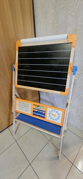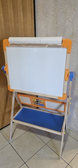 Prodajem dječju ploču za pisanje s dva radna polja - jedna strana je crna za pisanje kredom, a druga bijela za markere. Ploča stoji na stabilnom metalnom postoću s plastičnim nogama. Ima praktičnu policu ispod za odlaganje kreda, markera i druge školske opreme. Narandžasti plastični okvir oko ploče i plavi detalji na postolju. Ploča se može okretati i postaviti u željeni položaj.