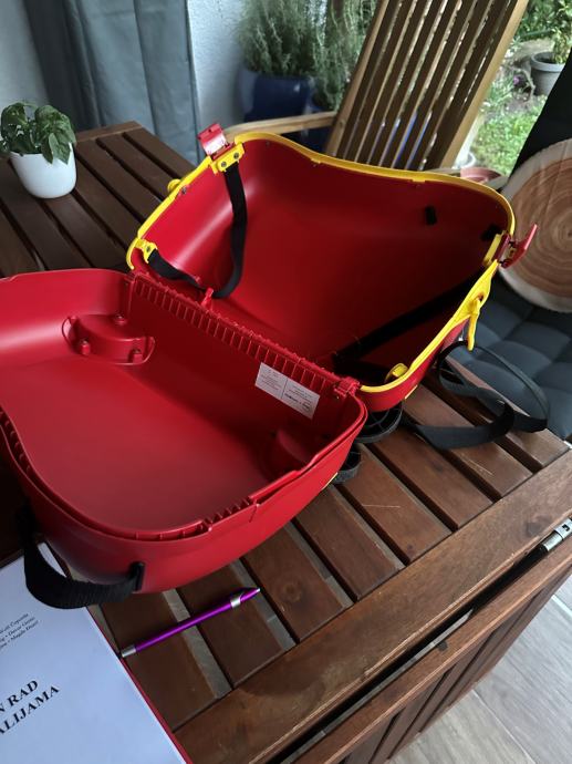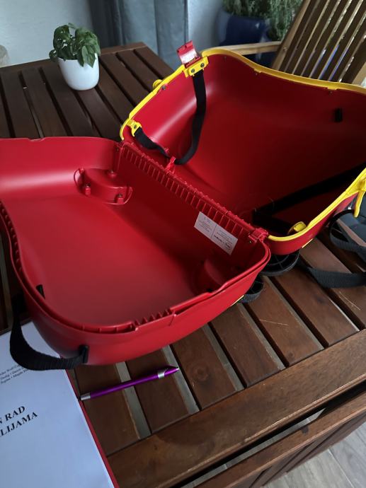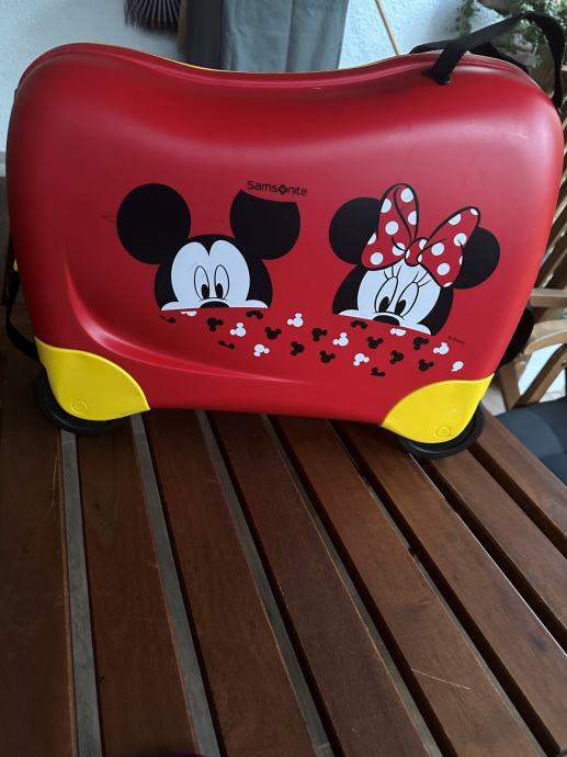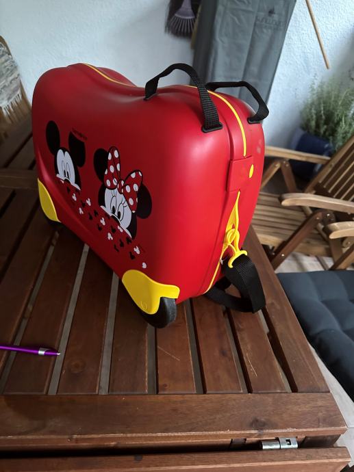 Crveni kofer sa četiri kotača sa originalnim likom Miny. Dijete na koferu može sjediti i može se vuć. Kofer je korišten samo za jedno putovanje. Kao nov.