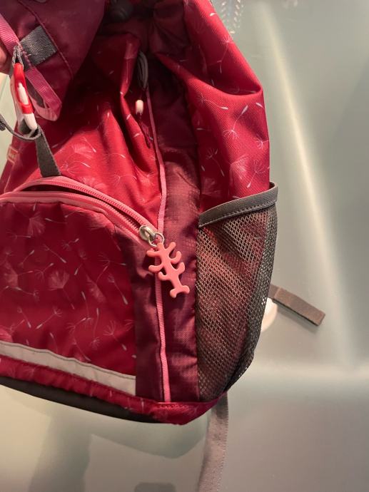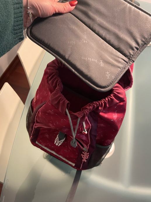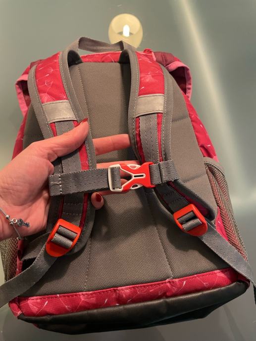 Djecji ruksak za vrtic ili izlete… s prakticnim pretincima, dodatkom za staviti pod guzu kad se sjeda na beton ili klupicu, prakticnom kopcom preko prsa da ne padaju naramenice.