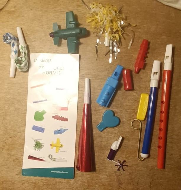 Set puhaljki za logopedske vježbe TalkTools® Horn Kit.
