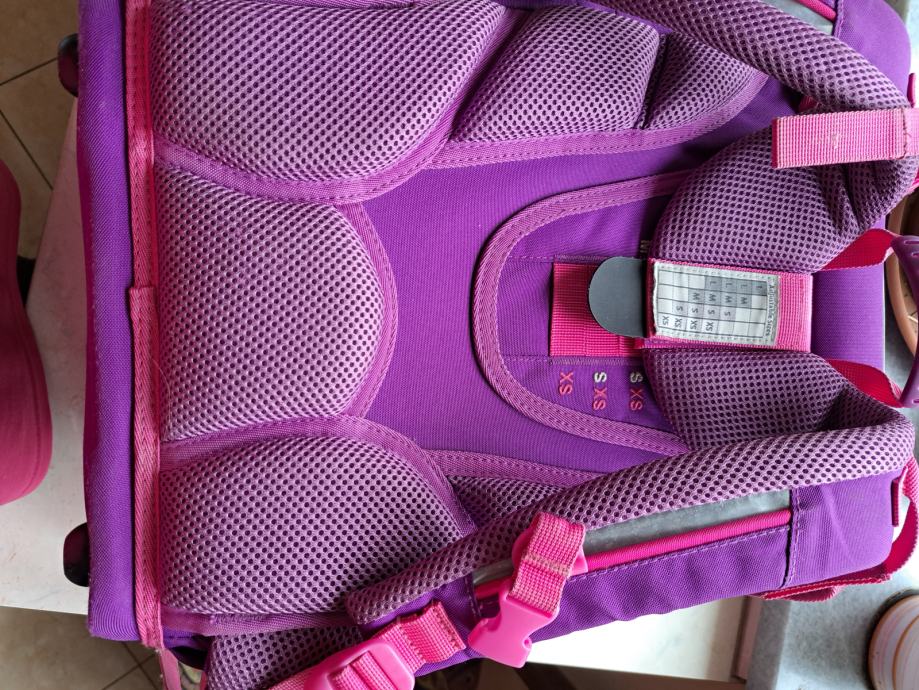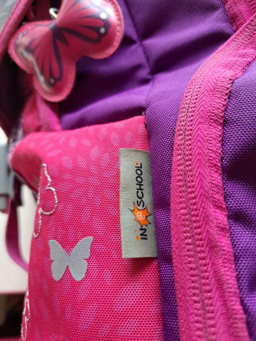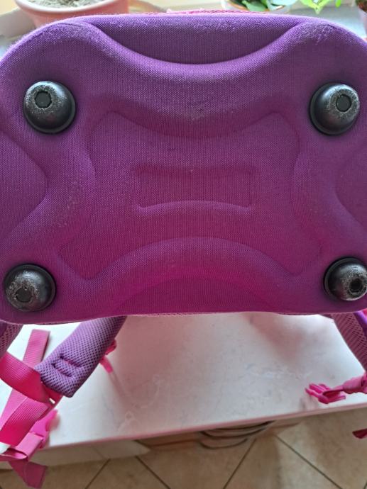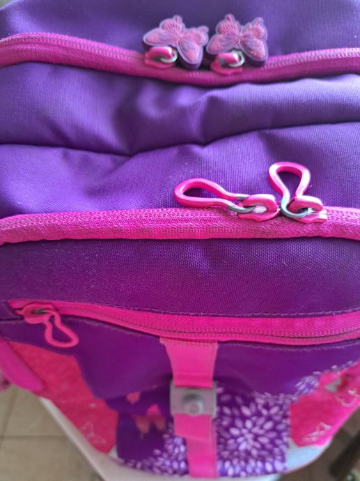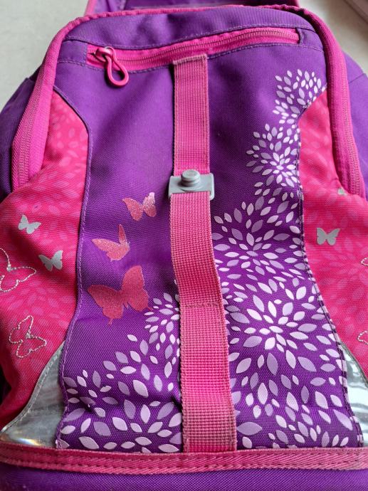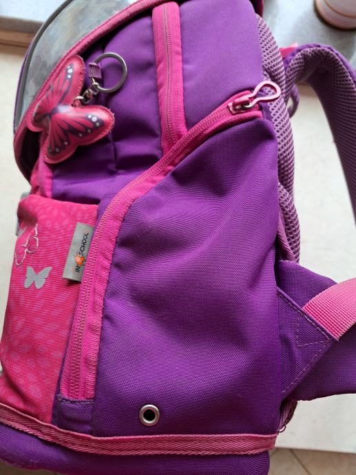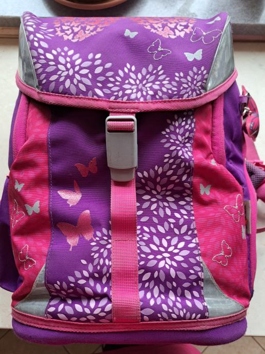 Torba se podešava iza, ovisno o visini djeteta. Izgleda kao kocka, ali je ustvari vrlo čvrsti ruksak, koji se kopča na 2 mjesta odnaprijed.ima 3 pretinca pa stane unutra puno knjiga i vrećica za tjelesni. Sa strane je bočno 1 pretinac za bocu i 1 pretinac za maramice.