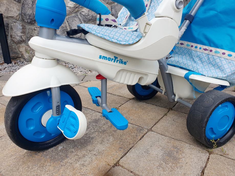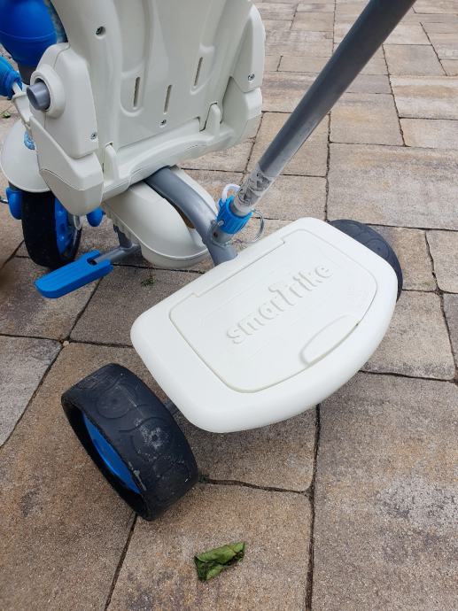 Oslonci za stopala se preklopljeni, kako bi dijete imalo kontrolu nad pedalama, ali roditelji i dalje mogu kontrolirati tricikl.