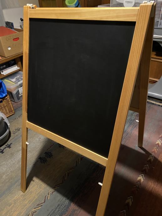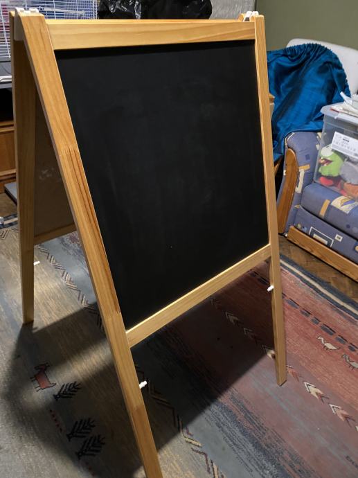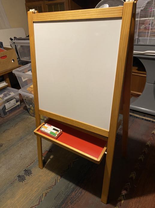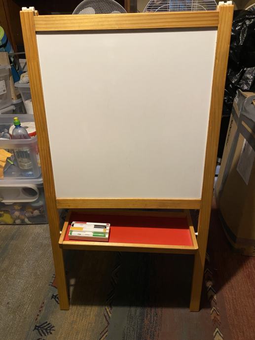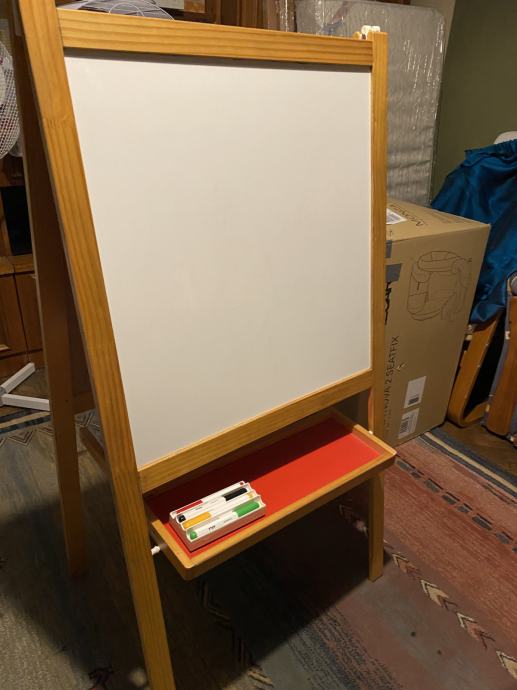 Prodajem očuvanu ispravnu ploču za crtanje IKEA. Nova više nije u ponudi. Visina štafelaja - ploče sa nogicama je 120 cm a širina ploče 62 cm. Uz ploču ide i originalna spužva za brisanje ploče te flomasteri za crtanje.