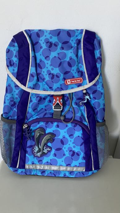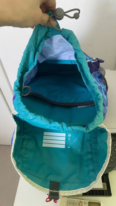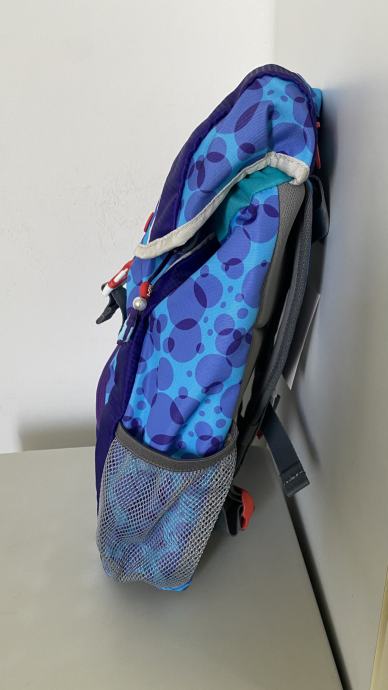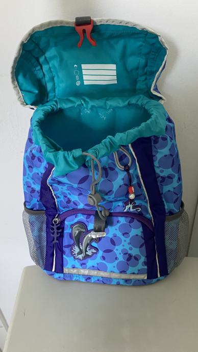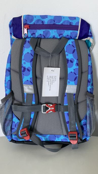 Ima jedan veliki glavni pretinac i 2manja pretinca na patent. Sa svake strane su mrežasti pretinci za npr. bocu, podesive i podebljane naramenice, jastuk za sjedenje, magnet na temu dupina