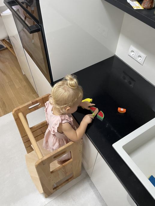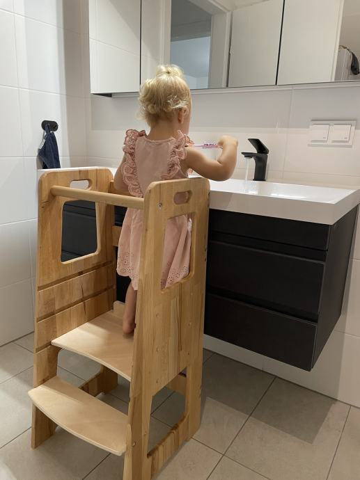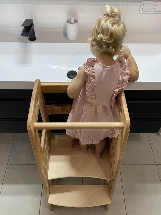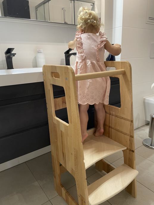 Kvalitetni ručno izrađeni toranj, sigurno i praktično dječje pomagalo koje potiče samostalnost i kreativnost. Omogućuje uključivanje djeteta u obavljanju kućanskih aktivnosti s roditeljima.