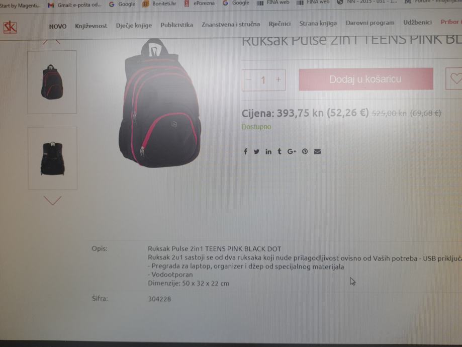 Prodajem torbu-ruksak za školu. Jako kvalitetan, ima 4 pretinca i dva mala. Mogu se spojiti slušalice. Nema tvrdo dno ali je pojačano, ima i pojačana leđa, čvrste naramenice. Nošen u 6. i 7. razredu. Kupljen u Školskoj knjizi. Ima mogućnost odvajanja manjeg ruksaka (znači 2 u 1). Na zadnjoj slici se vidi torba sa stranica Školske knjige i opis koji je uz torbu.