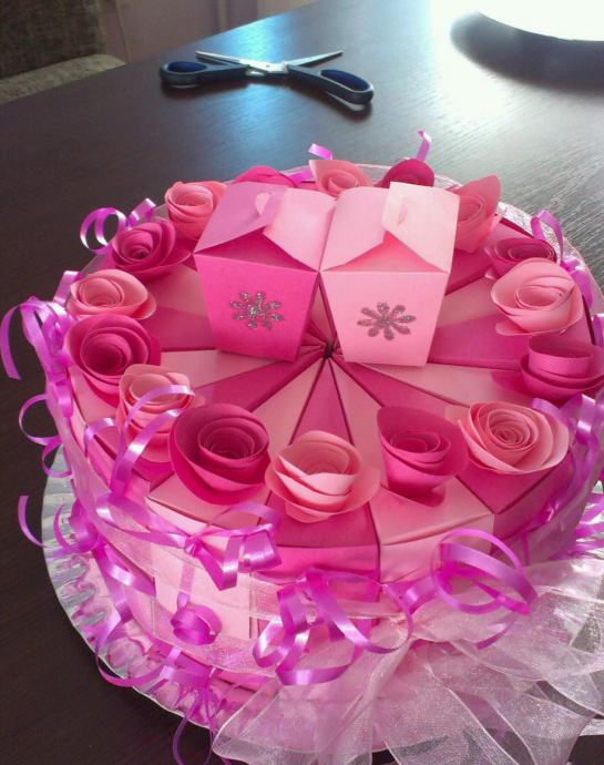 Torta od kartona (papira) " velike ružice" 24 kriški, posebno ukrašene sa dodatnim ružicama 3D na vrhu