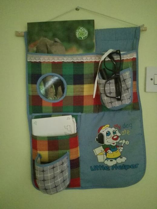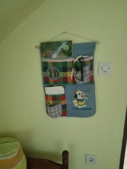 Prodajem platneni organizator- viseću policu za dječiju sobu pogodnu za ostavljanje češljeva,ogledalaca,šnalica,crteža i sl.Polica je visine 48cm i širine 35cm.