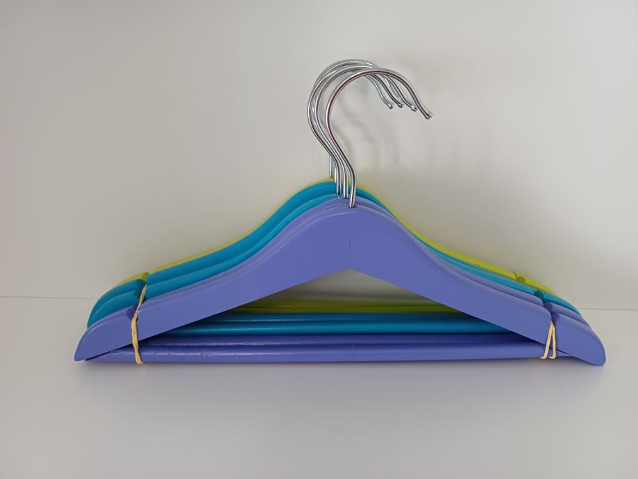 Vješalice su manjeg formata, prilagođene dječjoj odjeći, s metalnom kukom i prečkom za hlačice ili suknjice.