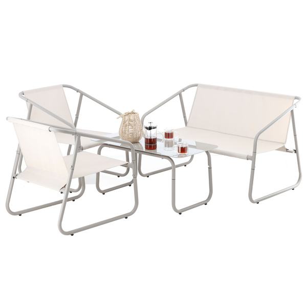 Ovaj set vrtnog namještaja uključuje dvosjed, dvije stolice i stol. Savršen je za vrt, terasu ili balkon, kombinirajući funkcionalnost i estetiku. Čvrsta čelična konstrukcija u kombinaciji s elegantnim kaljenim staklom osigurava trajnost i udobnost.
