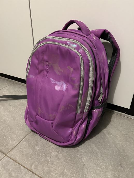 Putpuno ocuvan ruksak s manjim odvojivim ruksakom. Ljubicasto sivi sa svjetlucavim detaljima. Ruksak je cvrsti, lagan i ergonomski.