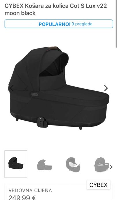Prodajem kosaru za novorodence Cybex Cot S Lux Moon black kupljenu prosle godine (svibanj 2024). Koristena kratko, potpuno ocuvana. Uz kosaru prodajem i adaptere za Cybex Eezy S twist+ 2 kolica ukoliko je netko zainteresiran. Kosara je kompatibilna sa kolicima Balios S Lux i Talos S Lux na ostala ide uz odgovarajuce adaptere. Iako nije na slici, (spremljen u kutiji jer nije nikad koristen) kosara naravno ima i platneni poklopac/pokrivac kao na zadnjoj slici. Garancija 2 godine znaci do kraja svibnja 2026.
