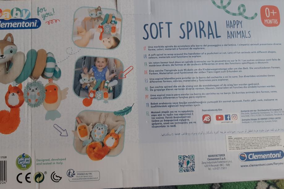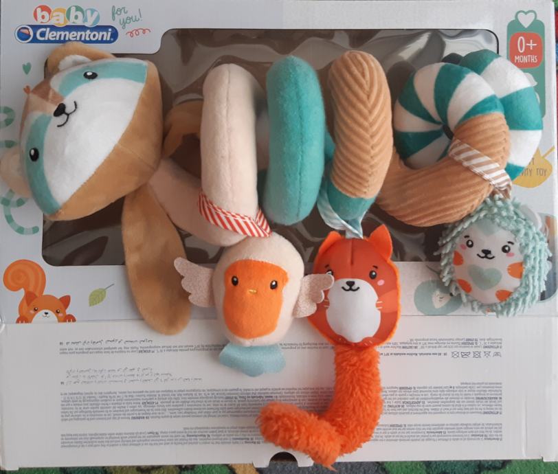 Višebojna baby spirala sa životinjskim privjescima, Clementoni. Simpatični rakun i njegovi nježni prijatelji iz šume pružaju zabavu i zabavnu dječju igru - dijete dodiruje razne materijale, a prate ga žive boje. Simpatičan privjesak vjeverica ima pahuljasti rep s efektom nabranosti, a jež i ptica imaju zvečku unutra. Ova prekrasna igračka potiče bebine vještine te vizualnu i slušnu percepciju.