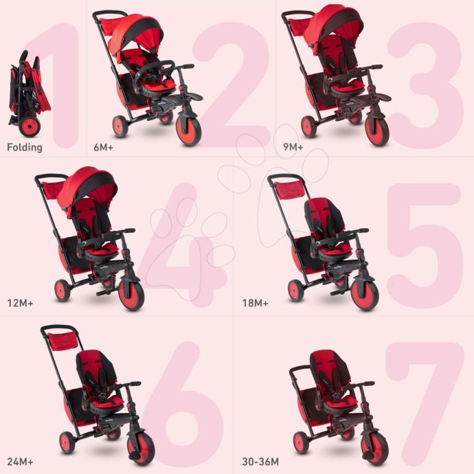 Faza 7 (32-36M +): potiče samostalnost. Preklopite ručicu upravljača, uklonite visoki naslon i sigurnosni pojas. Razvijanje motoričkih sposobnosti samostalnom vožnjom.