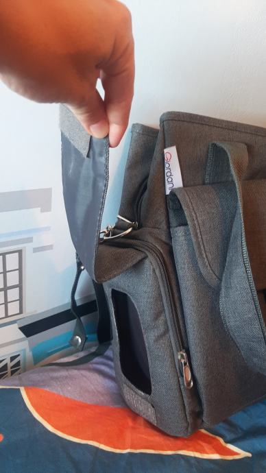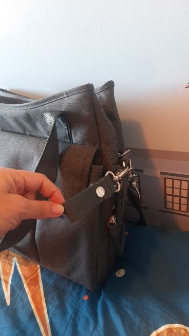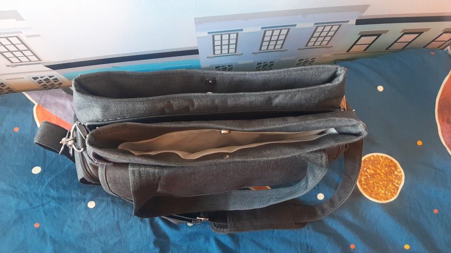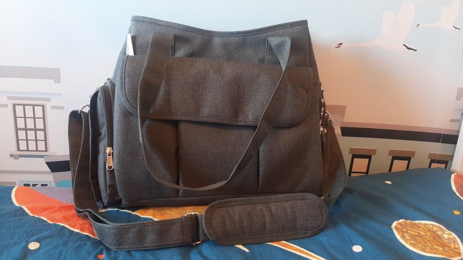 Torba je kao nova, korištena svega par puta. Unutra ima dijelove koji čuvaju toplo/hladno. Lako se objesi na kolica, a moẓže se nositi i preko ramena ili kao poštarska torba. Jako praktične, s puno odjeljaka. Kupljena u Trstu u Prenatal trgovini 2024.