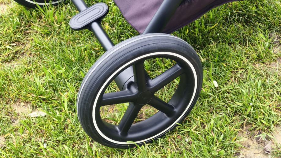 Vrlo kvalitetan i robustan dizajn kolica. Veliki kotači za sve terene, otporni na bušenje (bez zračnica), sa mogućnošču zaključavanja i suspenzijama na prednjim kotačima.