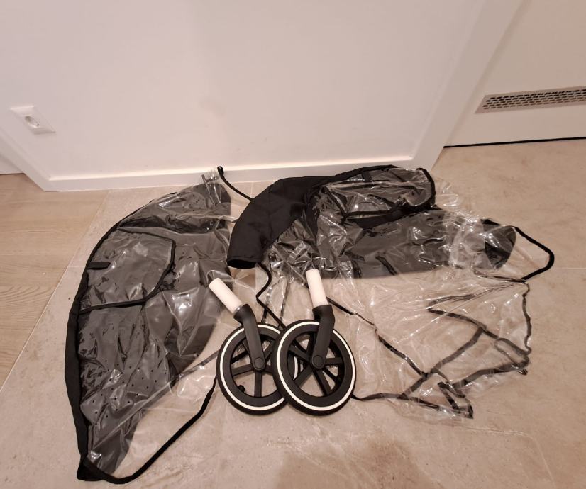 U paketu se nalazi konstrukcija, sportski dio, košara, jaje, svi potrebni adapteri, rezervni kotači te kabanice za jaje i sportski dio.