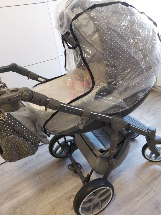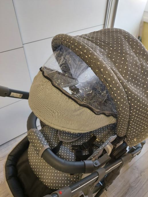 Jaje se veze s pojasom od sijedala u autu,ima umetak za novorodence,i pomocu adaptere se montira na kolica koje dobite uz kolica.