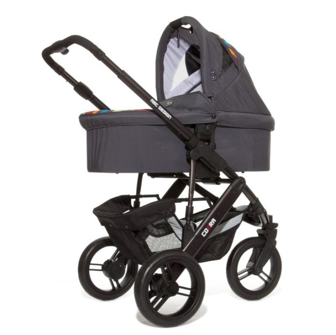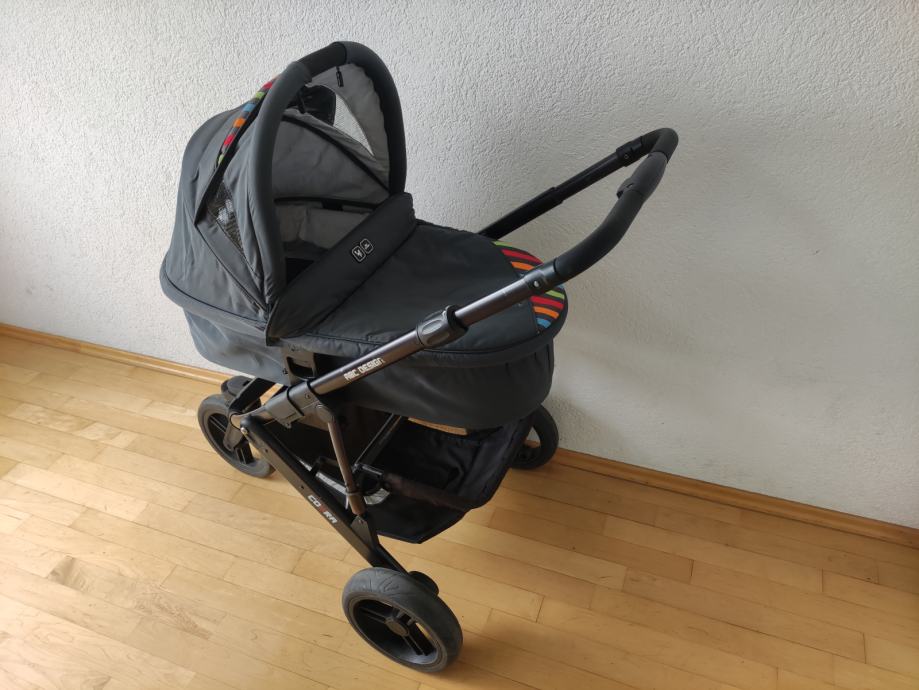 Dječja kolica ABC Design Cobra su lagana kolica s tri velika kotača kojima se može jednostavno upravljati i po zahtjevnijem terenu. Ovaj set uključuje laganu aluminijsku konstrukciju, košaru za novorođenče, sportski dio, autosjedalicu jaje sa adapterima (može se staviti na konstrukciju kolica),.Naslon sportskog dijela može se postaviti u 3 položaja. Oslonac za noge podesiv je po visini. Krov kolica ima UV 50+ zaštitu od sunca te je vodonepropustan. Na donjem dijelu nalazi se praktična i velika košarica za kupovinu. Svi kotači mogu se skinuti što olakšava transport. Kolica imaju kočnicu za parkiranje, ojastučen sigurnosni pojas, te zaštitnu prečkicu koja se može skinuti. Presvlaka se može prati. Svi nastavci za konstrukciju kolica mogu se staviti u oba smjera vožnje. Kolica su korištena samo za jedno dijete i u odličnom su stanju. Osobno preuzimanje.